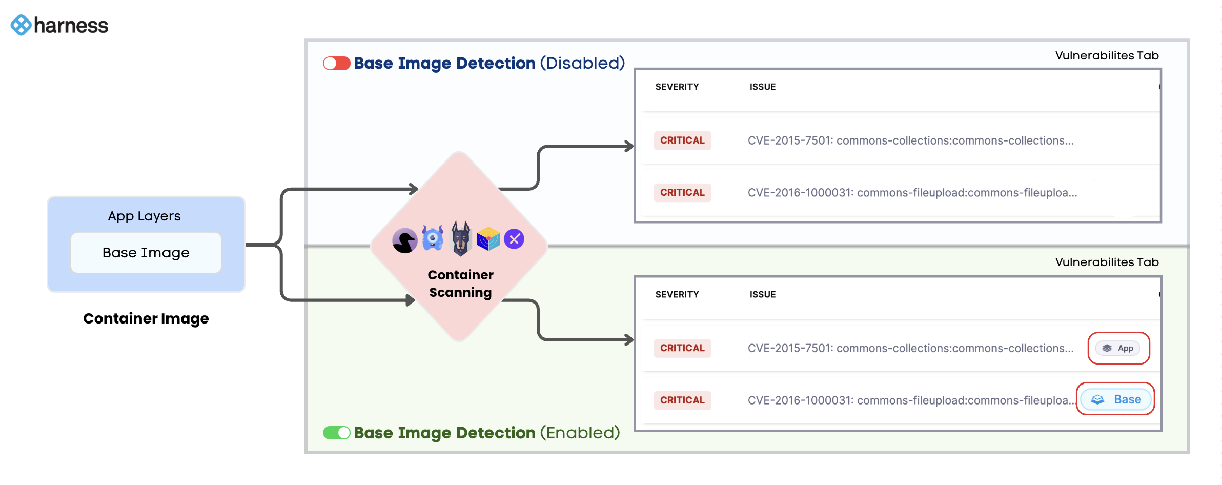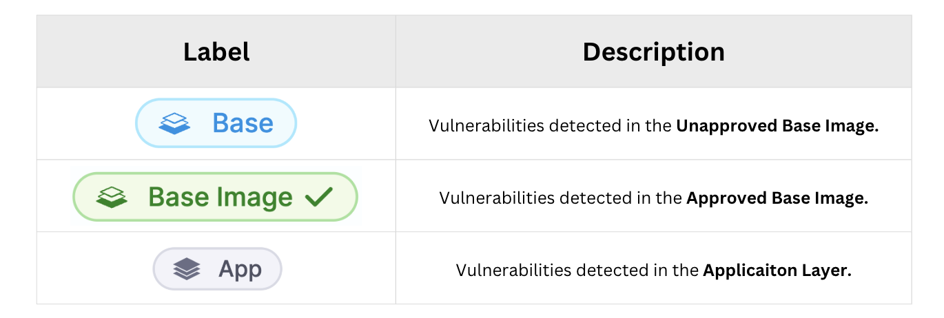Base: These are the vulnerabilities detected in the base image of your application.Baselabel in Blue color: vulnerabilities detected in an unapproved base image.Base Imagelabel in Green color: vulnerabilities detected in an approved base image. Refer to Approve Base Image for more details.