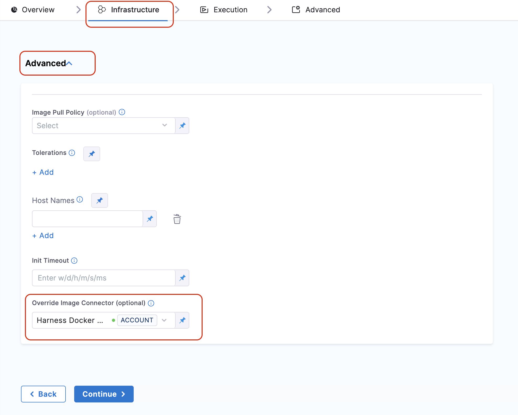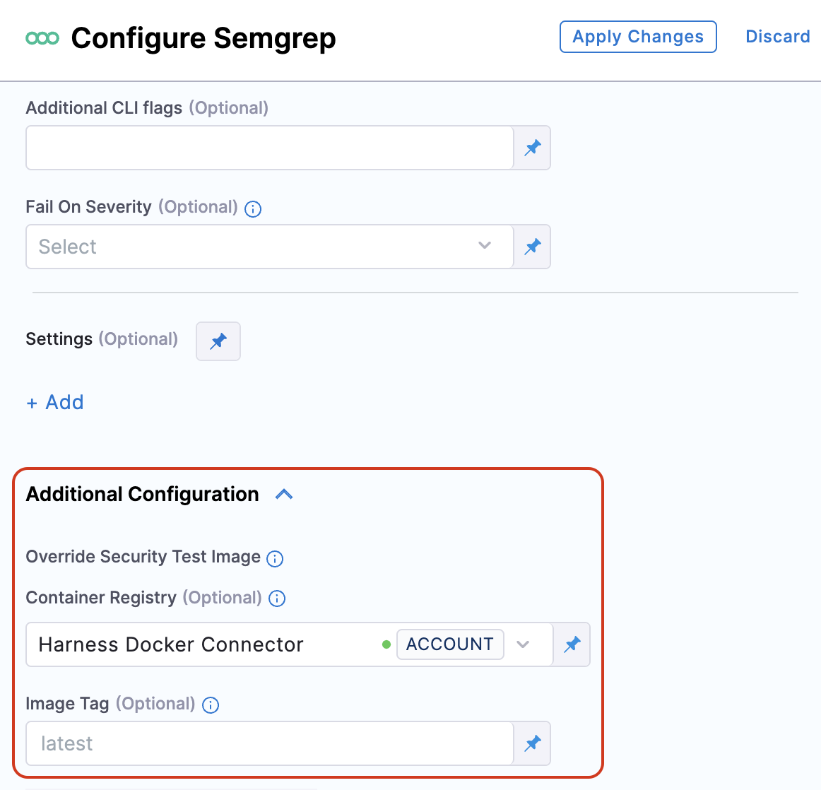 - Set your private registry and tag under Override Security Test Image section. By default, the step will look for the