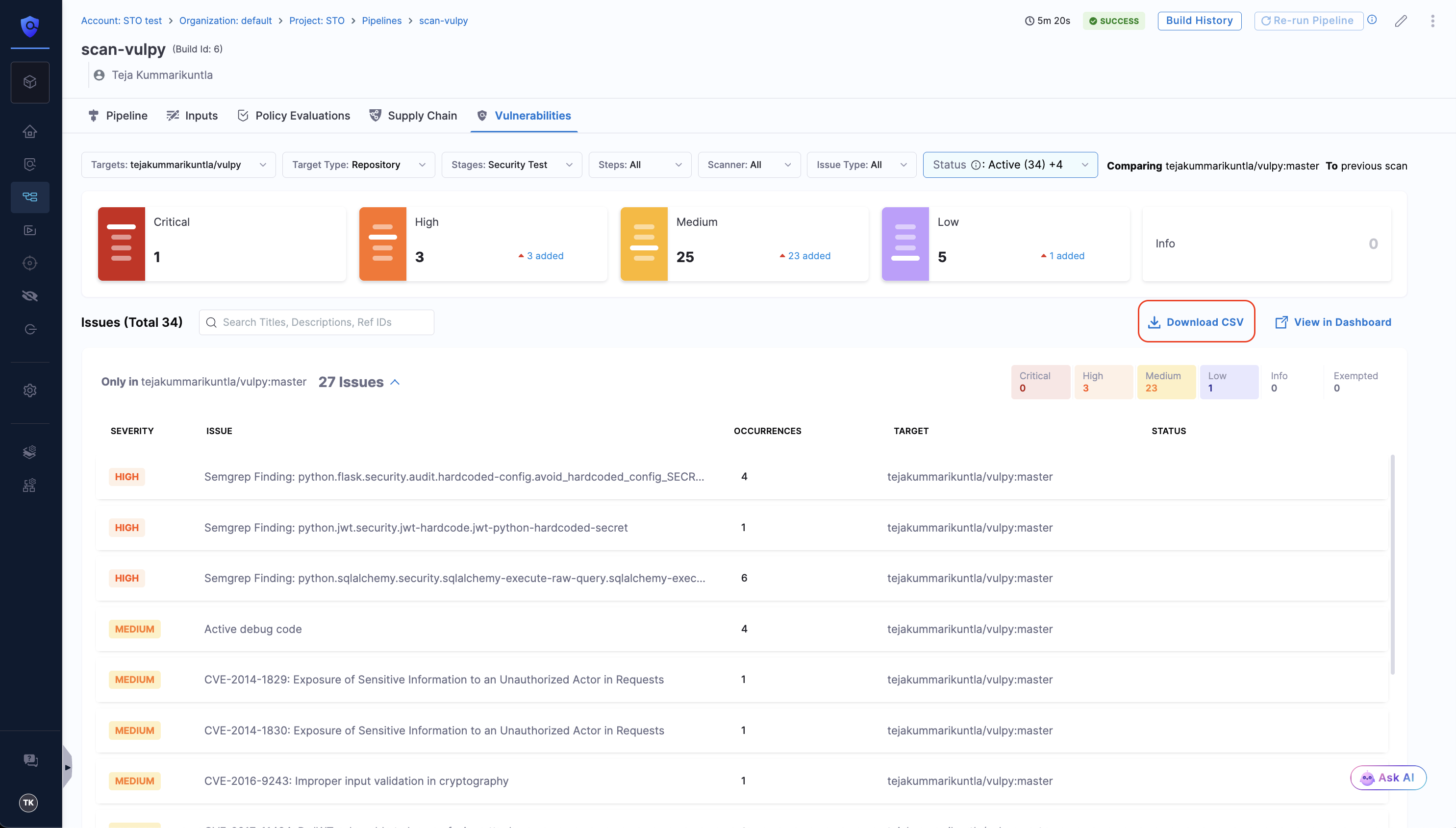 In the Vulnerabilities tab of a pipeline execution, select Download CSV to instantly export the scan results in CSV format.