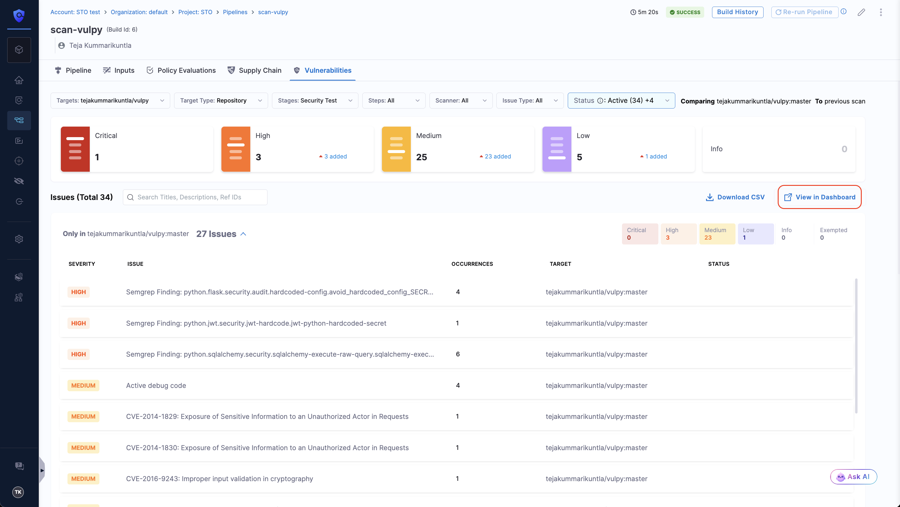 After a successful pipeline scan execution, you can view results in the Vulnerabilities tab of the pipeline execution window.