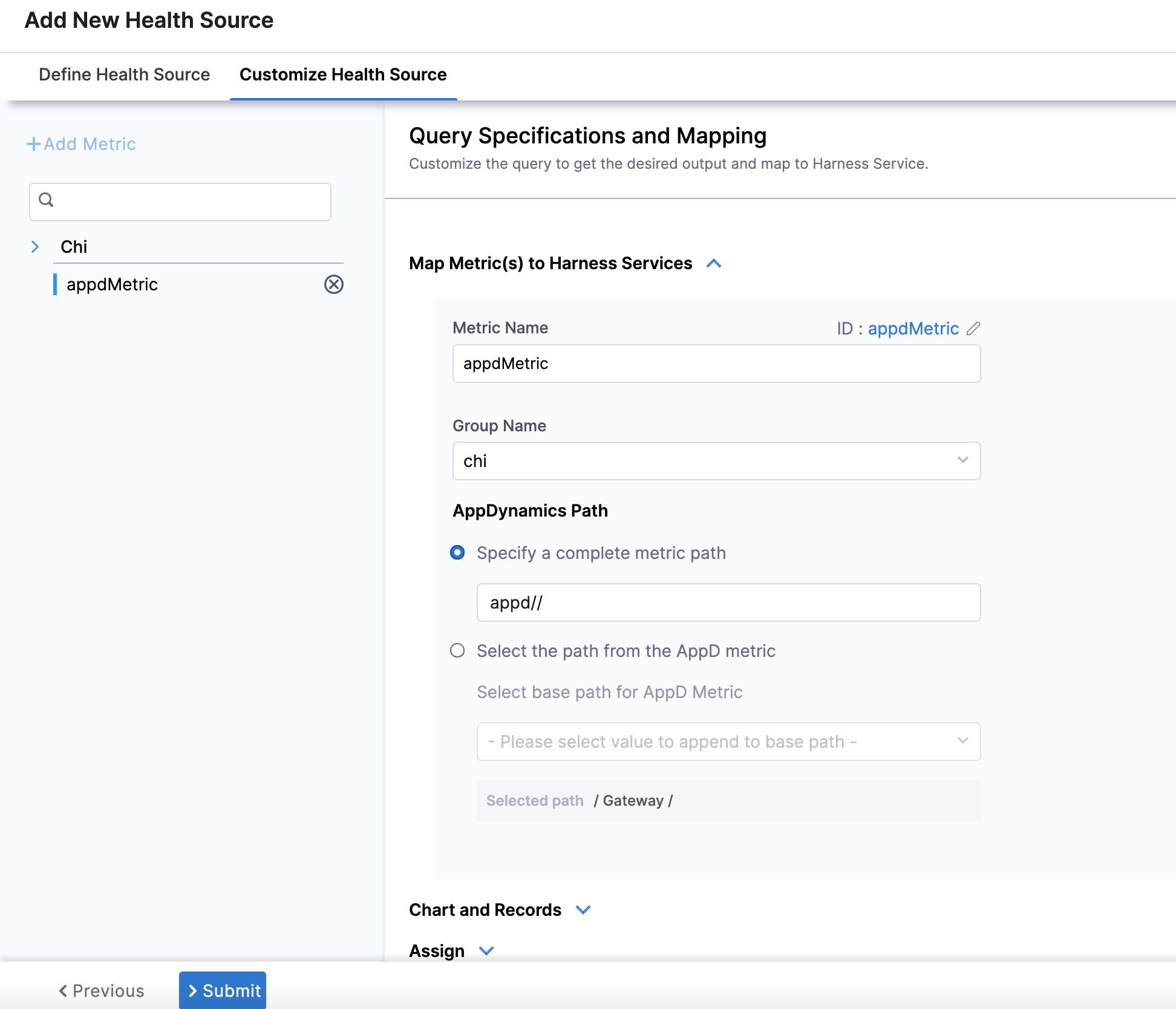 In AppDynamics Path, you can either provide the complete metric path in Specify a complete metric path, or provide the base path of the AppDynamics metric in Select the path from the AppD metric.
