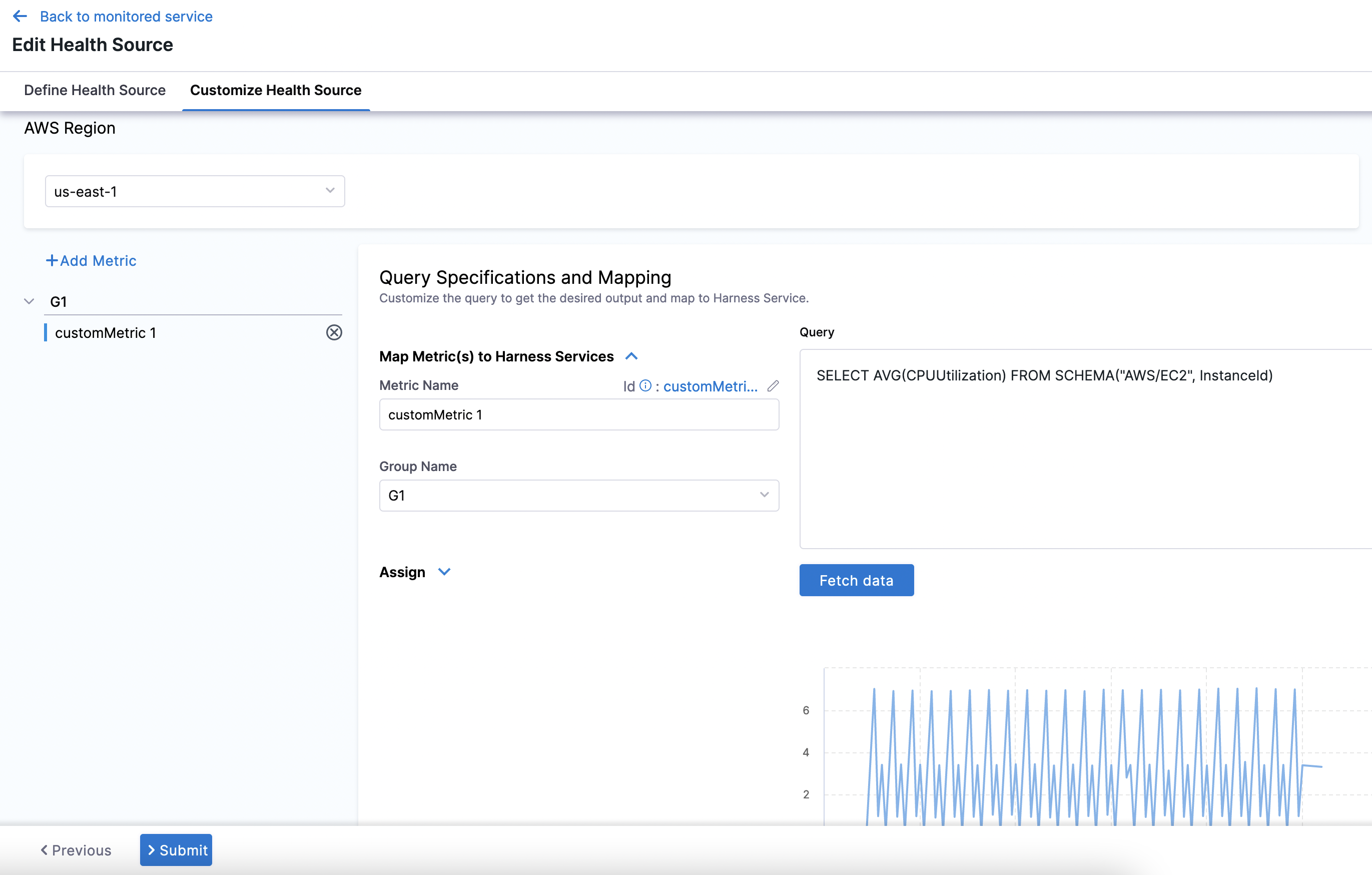 You can customize the metrics to map the Harness Service to the monitored environment in Query Specifications and Mapping settings. The subsequent settings in Customize Health Source depend on the Health Source Type you selected. Click Map Queries to Harness Services dropdown. -