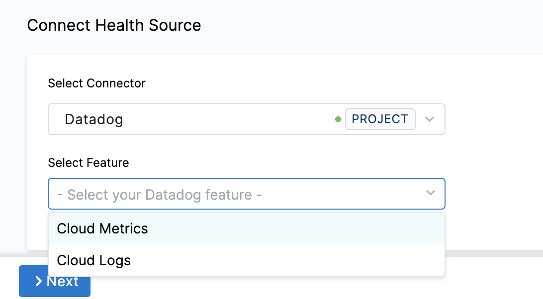 In Select Feature, select the Datadog feature to be used. You can choose Cloud Metrics or Cloud Logs.