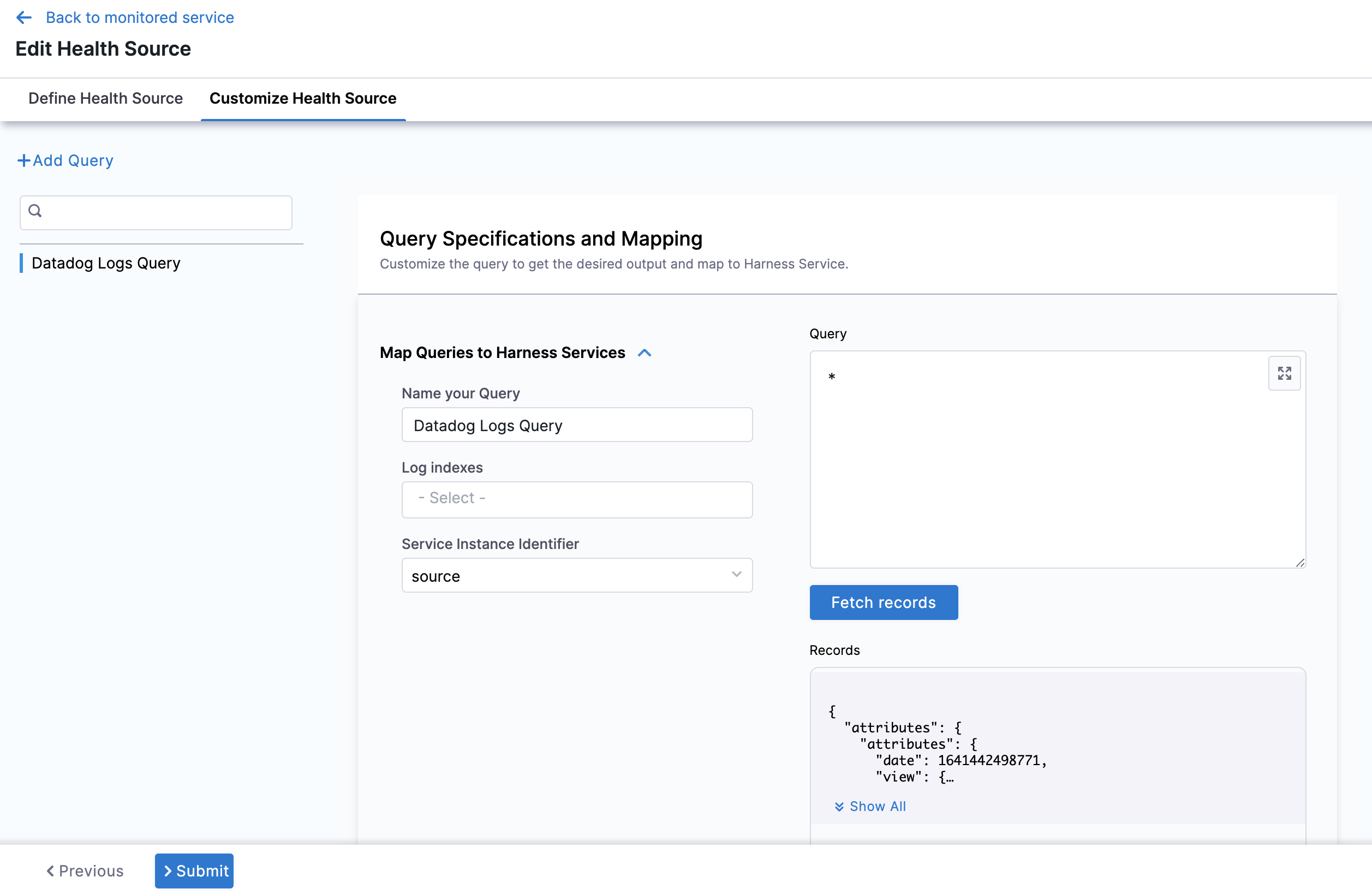 You can customize the metrics to map the Harness Service to the monitored environment in Query Specifications and Mapping settings.