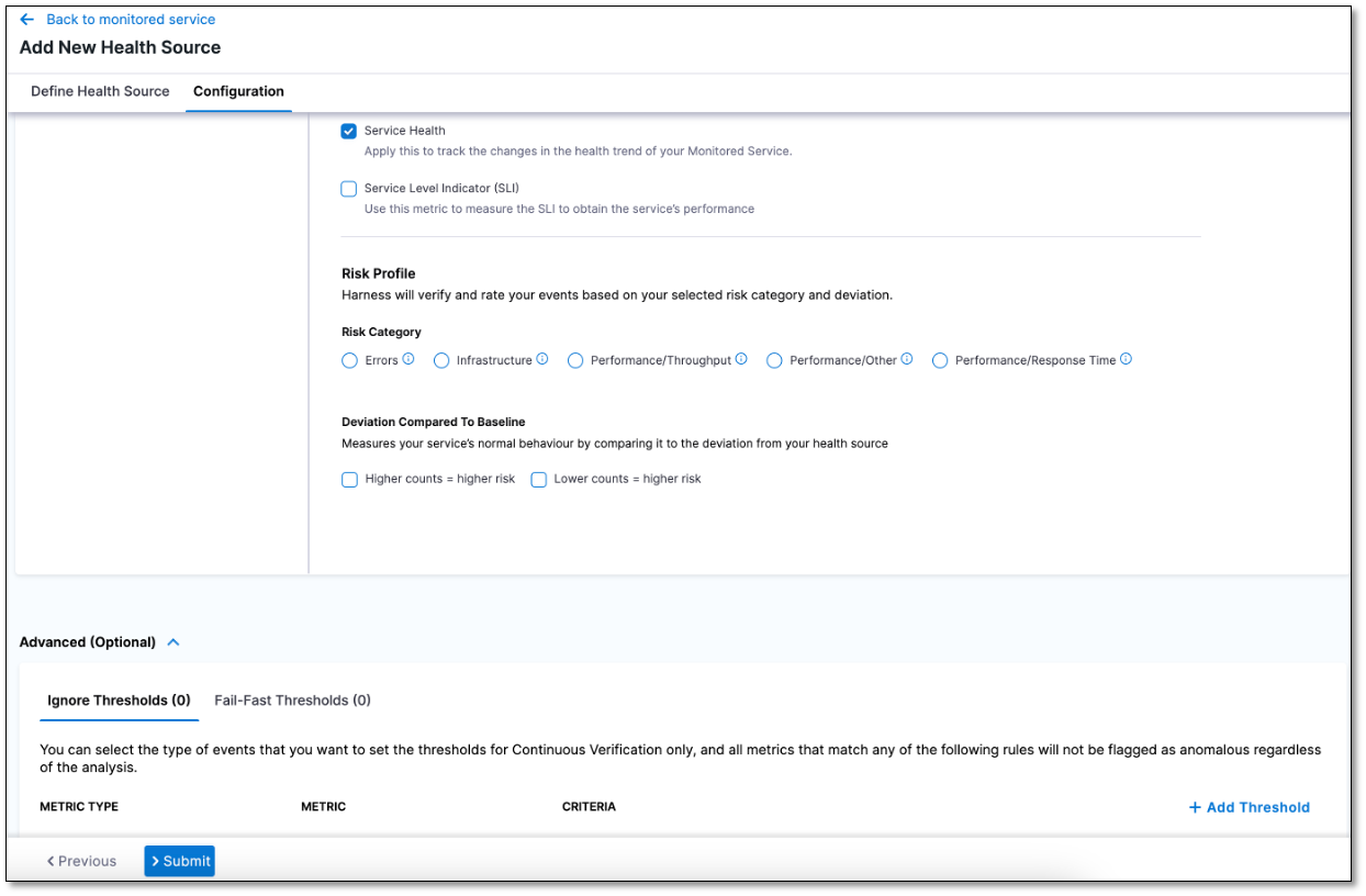 While setting up the threshold-compatible health source within a monitored service, navigate to the Advanced (Optional) section.