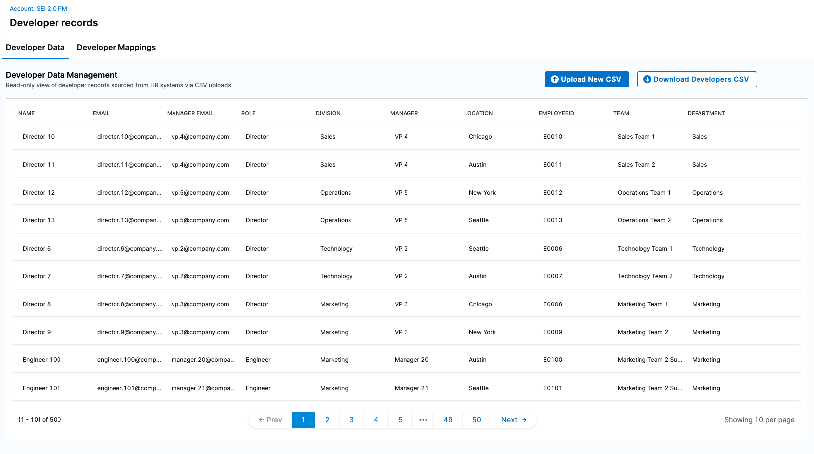 - Developers: Imported from HR systems via CSV and managed at the account level.