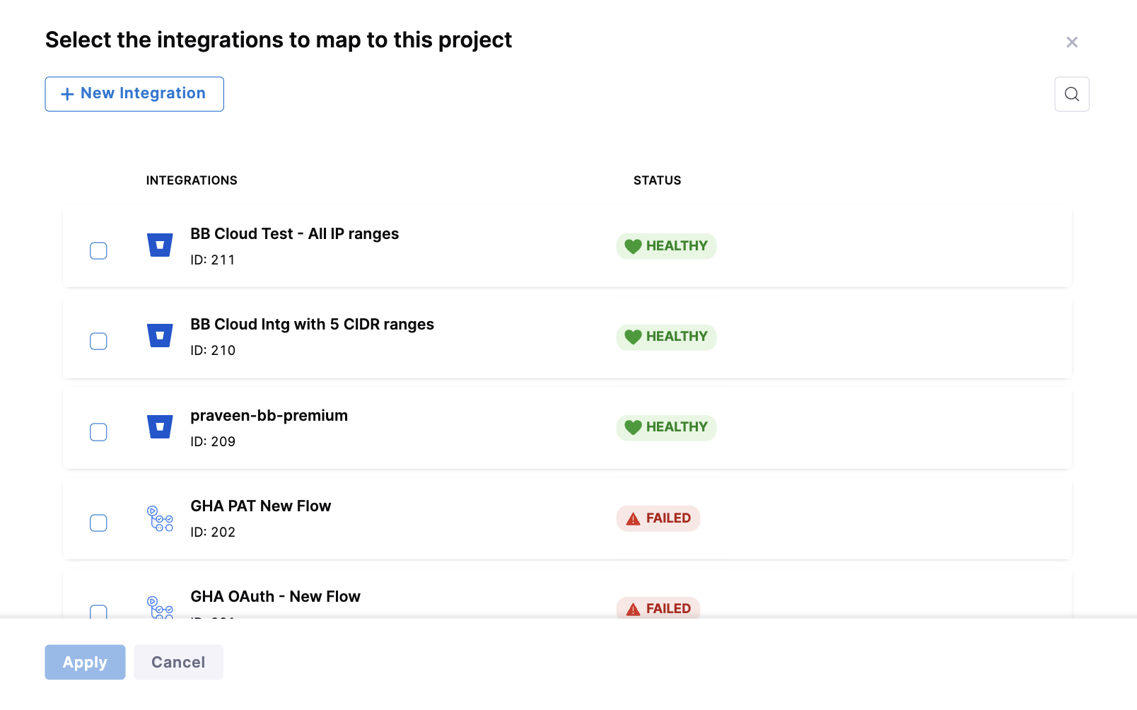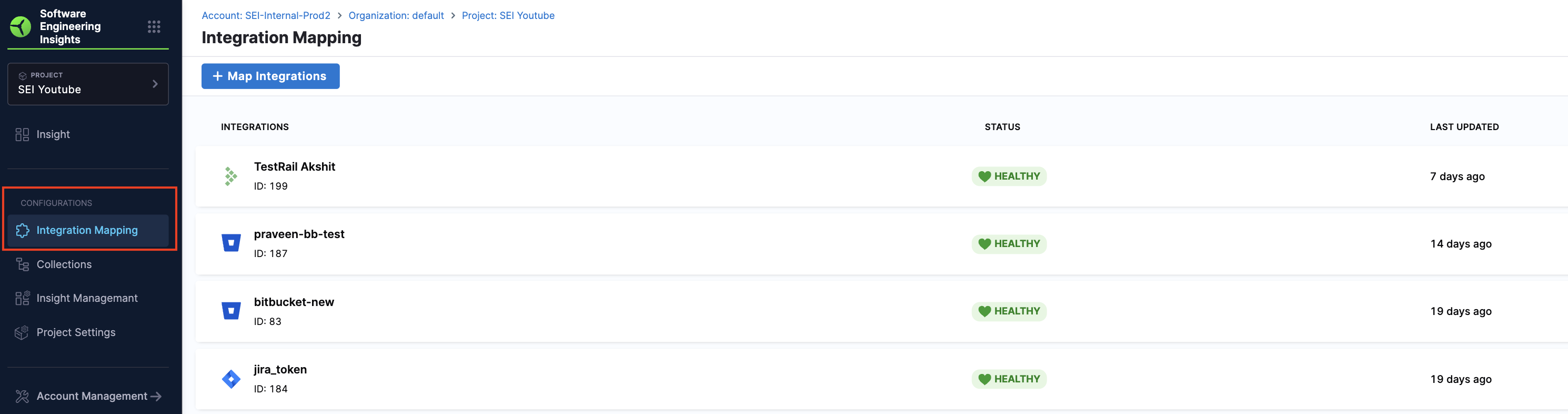 Integration mapping refers to the process of associating existing or new integrations with your current project. After creating the project, you can proceed to set up and map integrations to it. It's important to associate the integrations correctly with the project in order to ensure that the widgets on the Insights 2.0 page display accurate data.