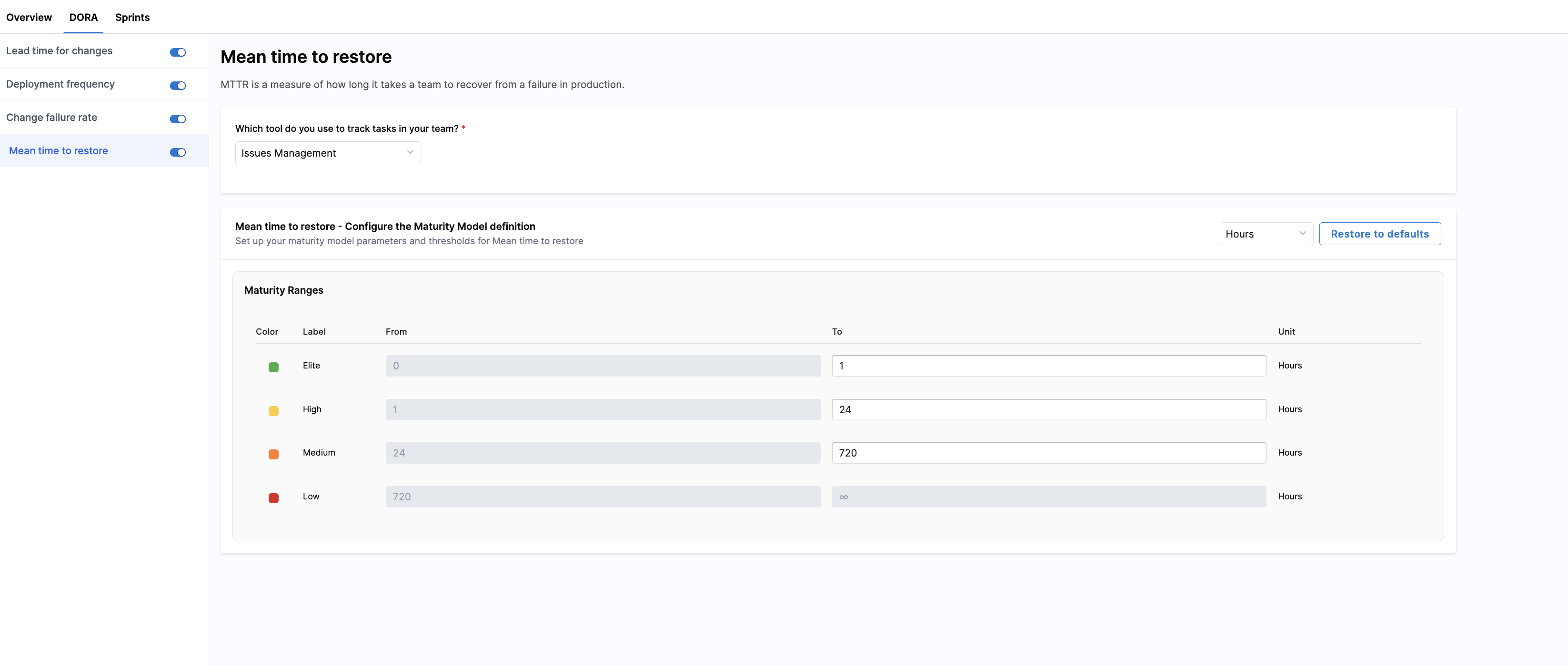 You can classify your teams' mean time to restore (MTTR) performance into four color-coded bands in the Maturity Ranges section. Customize thresholds for Elite, High, and Medium performance; the Low band is automatically inferred.