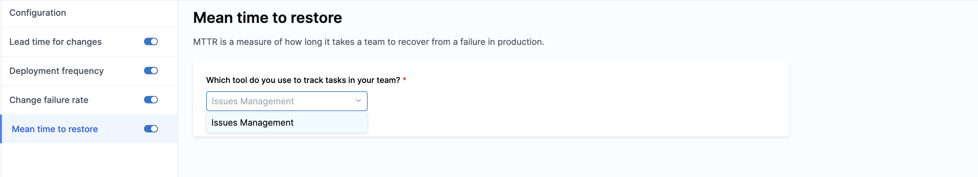 - Configure Deployment Frequency, Change Failure Rate, and MTTR