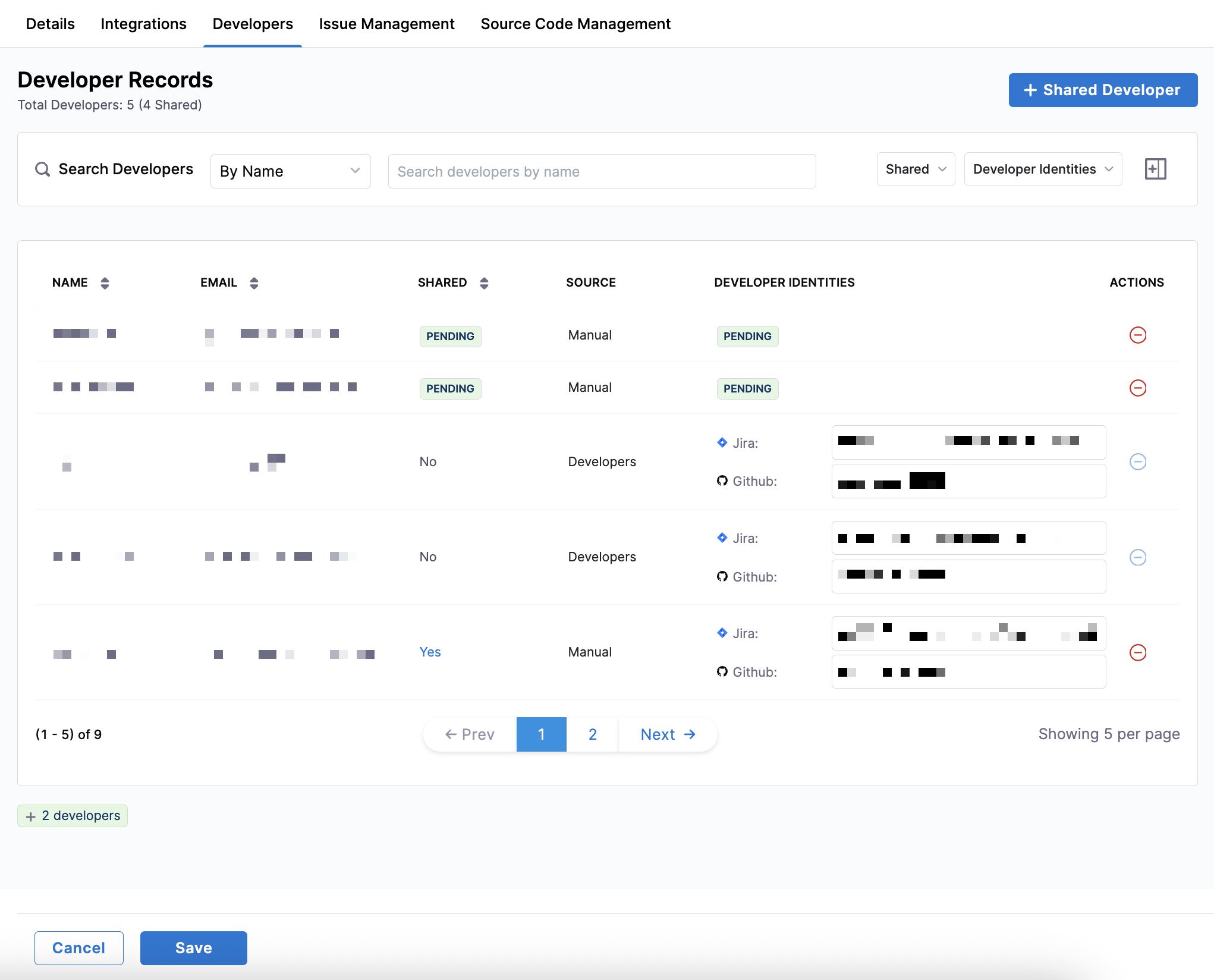 Source: Developers added through the API or CSV upload, appear withSource: Developers. Developers added in the UI appear withSource: Manual.Shared: Developers inherited from the team's Org Tree leaf node appear withShared: No. Developers who are not from this team (or Org Tree node) but are manually added because they contribute to the team's work appear withShared: Yes.