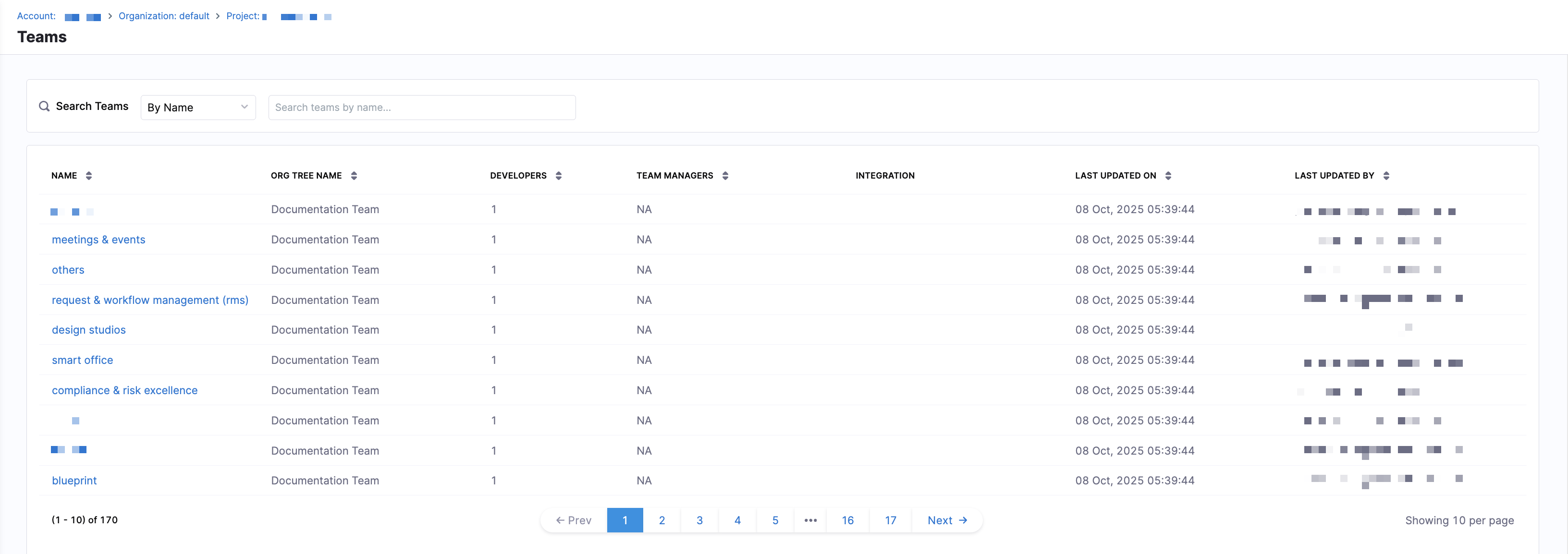 The Teams page provides a centralized view of all teams derived from your Org Tree and their configurations. You can search teams by selecting By Name, By Manager Name, or By Org Tree Name in the Search Teams dropdown menu.