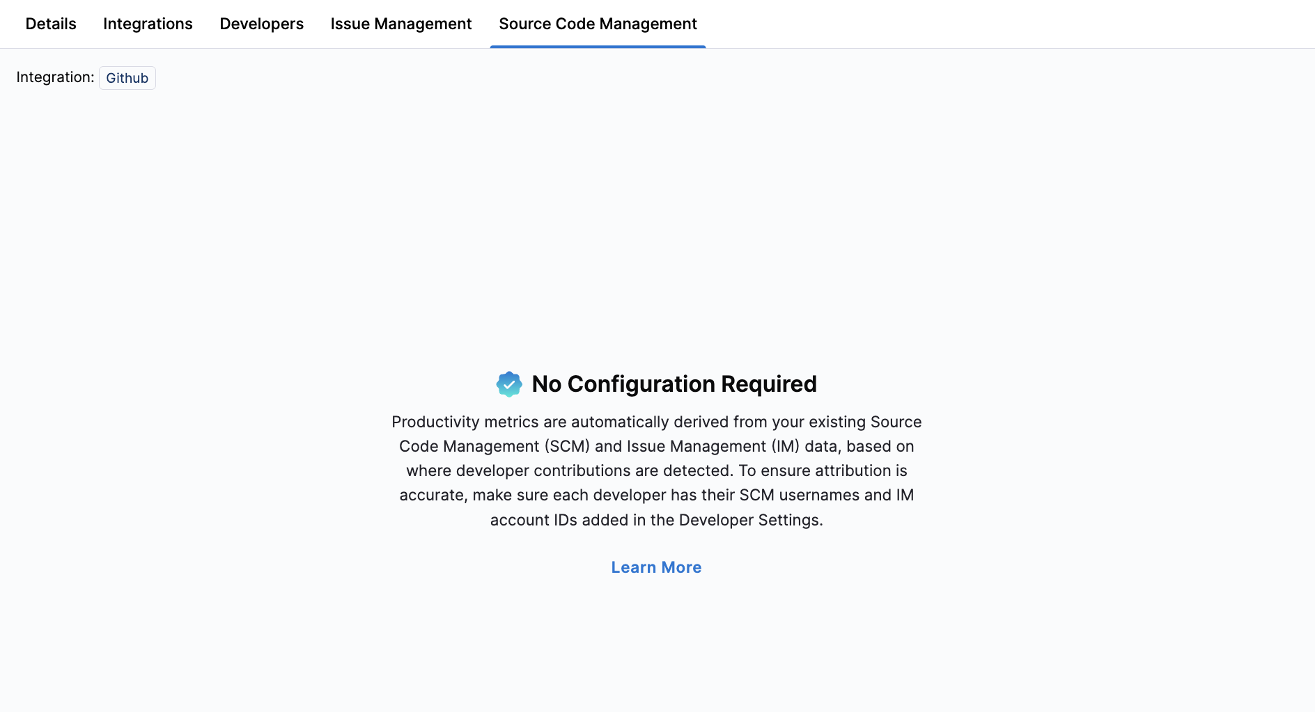 Developer identifiers can be automatically discovered using Auto Identity Discovery or manually configured if needed. If you select multiple SCM integrations on the Integrations tab, you must include all repositories your team contributes to for more complete metric calculations.