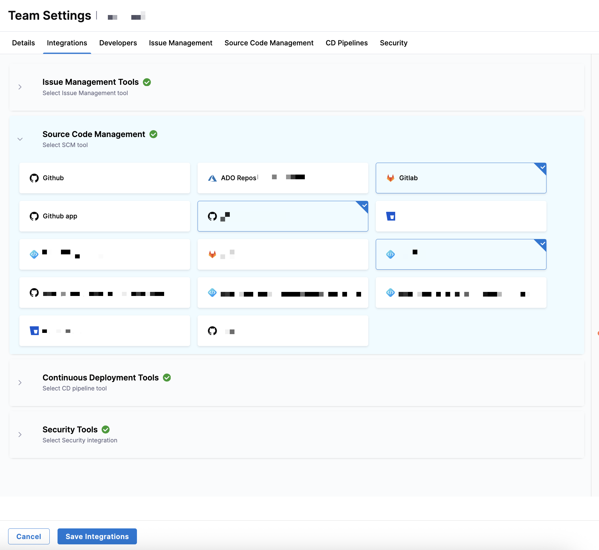 Select integrations from the following sections: Issue Management, Source Code Management, Continuous Deployment, Security, and Code Quality. You can select multiple SCM integrations per team.
