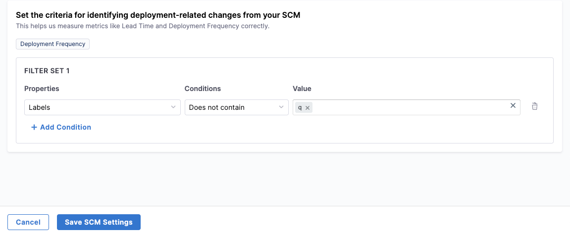 Label-based filters apply across all selected SCM integrations, ensuring deployment-related changes are identified consistently even when multiple SCM tools are configured. Once you've configured the repositories, branches, and deployment criteria, click Save SCM Settings to apply the configuration to the team.