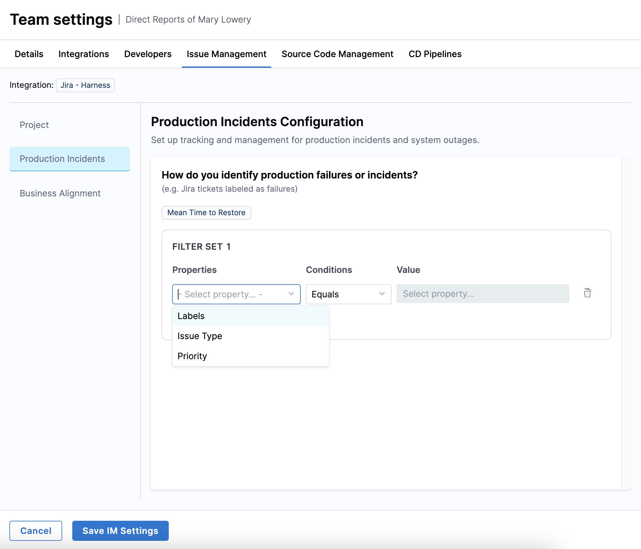 Create a filter set to track production failures and incidents on the Product Incidents tab.