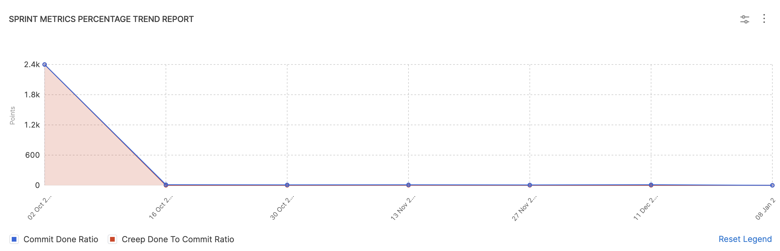 The widget calculates and displays the time series trend of the selected sprint metrics ratios. Find complete the list of the Sprint Metrics ratios here.