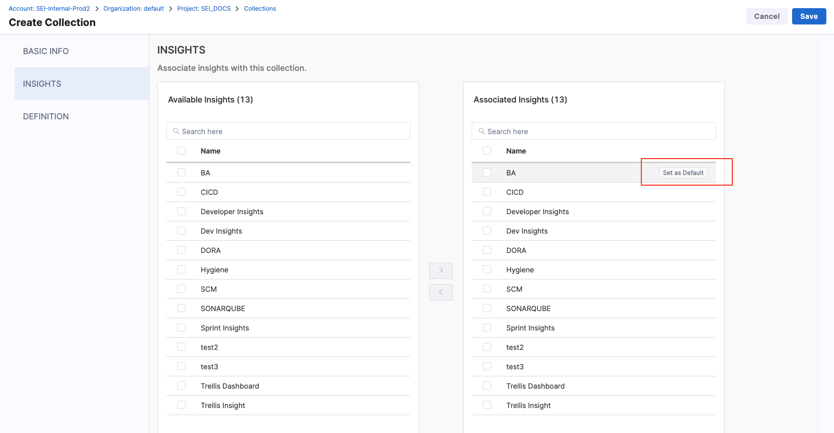 - Select Set as Default to designate the default Insight for the Collection.