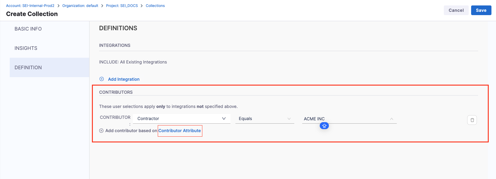 - Add the Integration Filters to determine the criteria to associate Contributors with the Collection.
