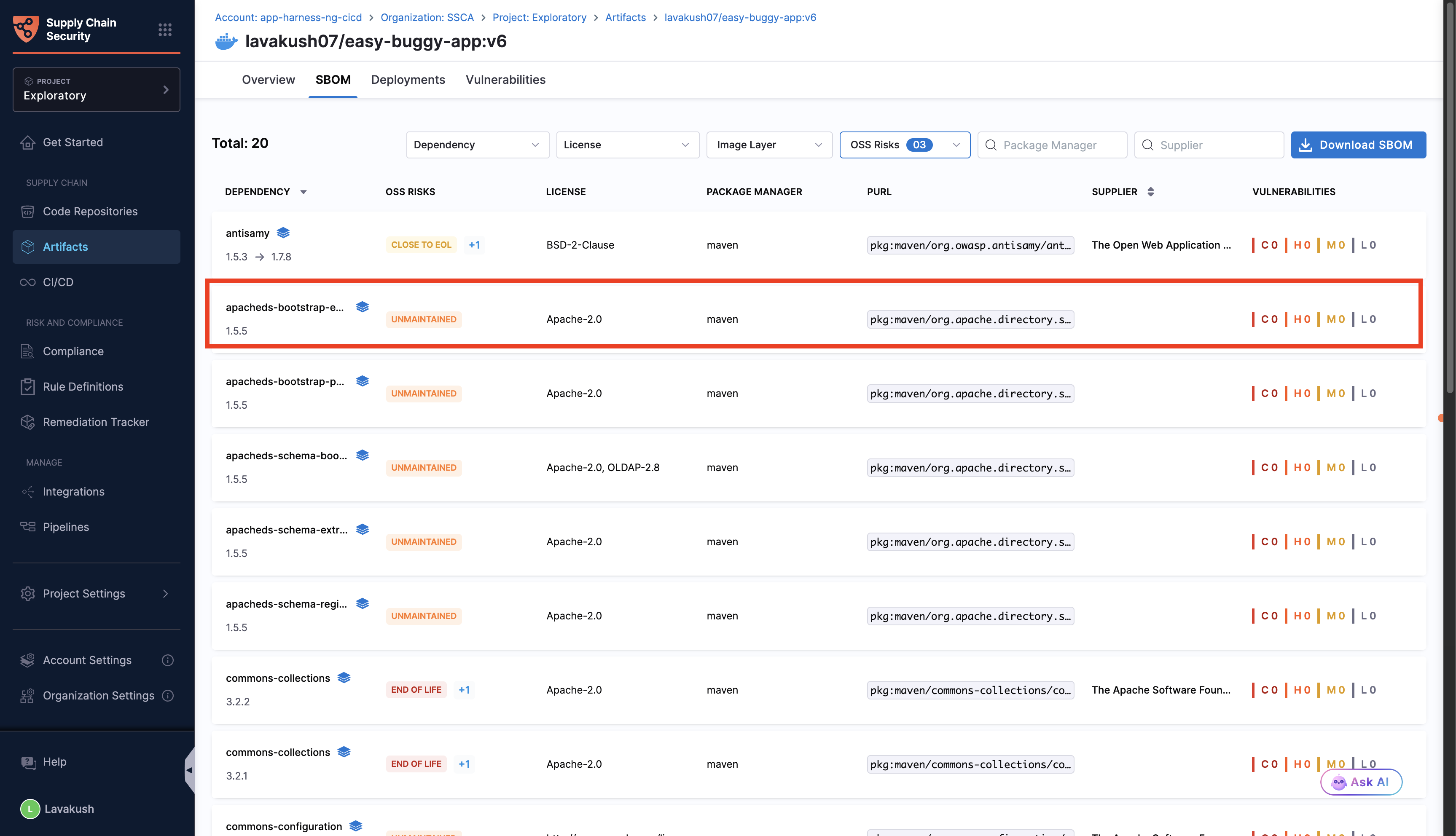 An unmaintained component is one that has not received any version upgrades in the past year. In the SBOM tab, such components are marked with an alert symbol. Create a Jira ticket to replace it with an alternative component.
