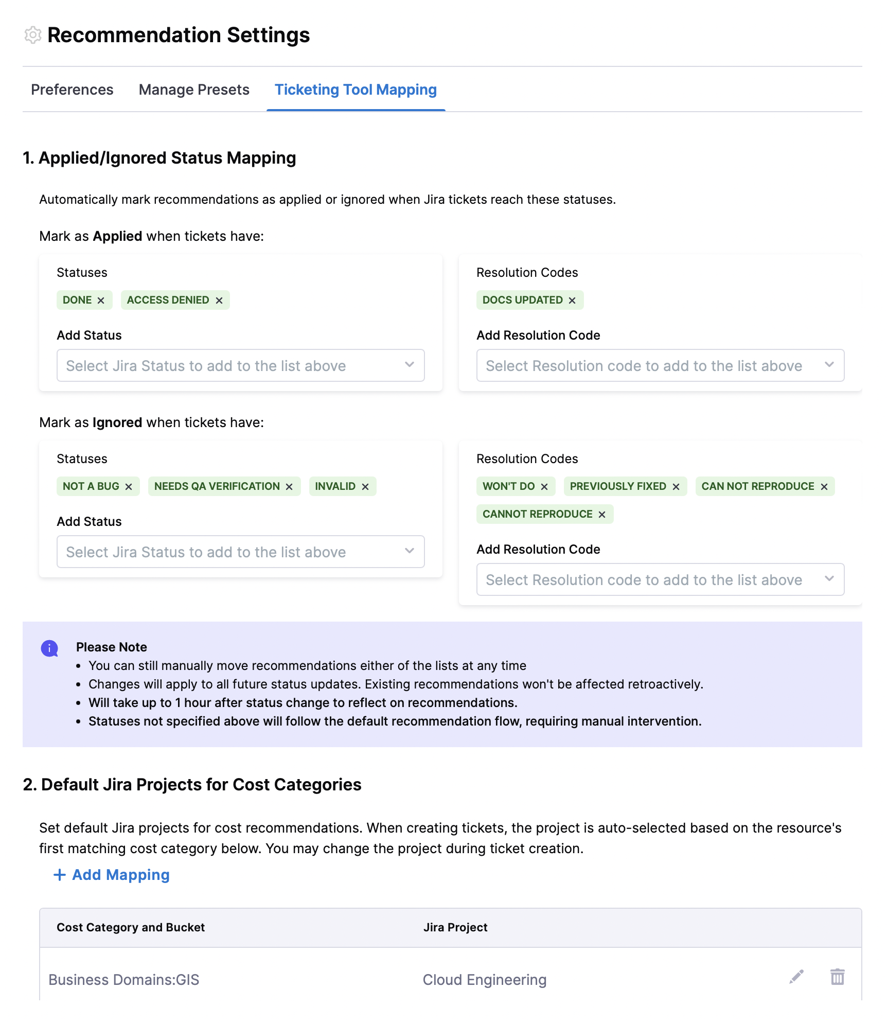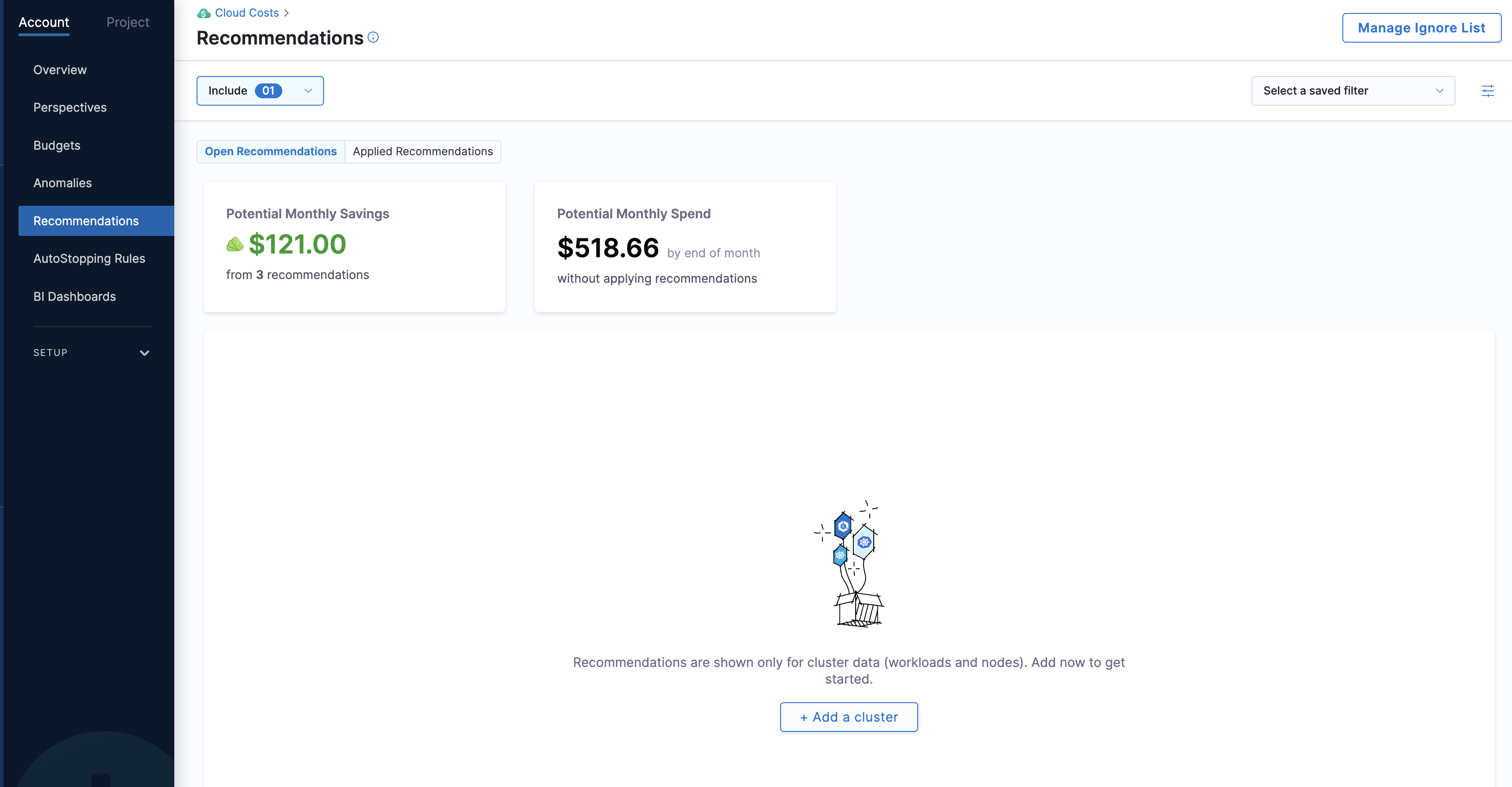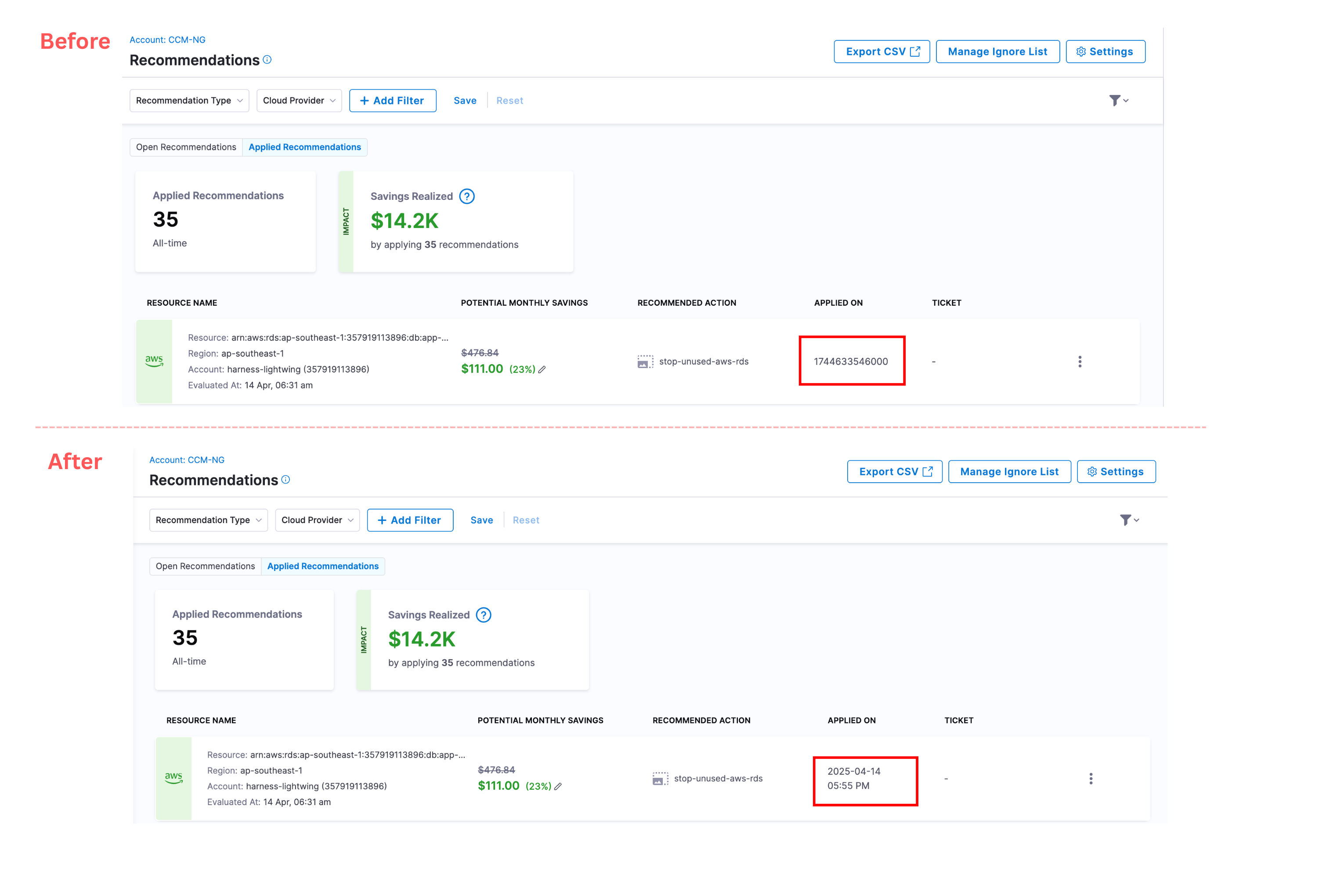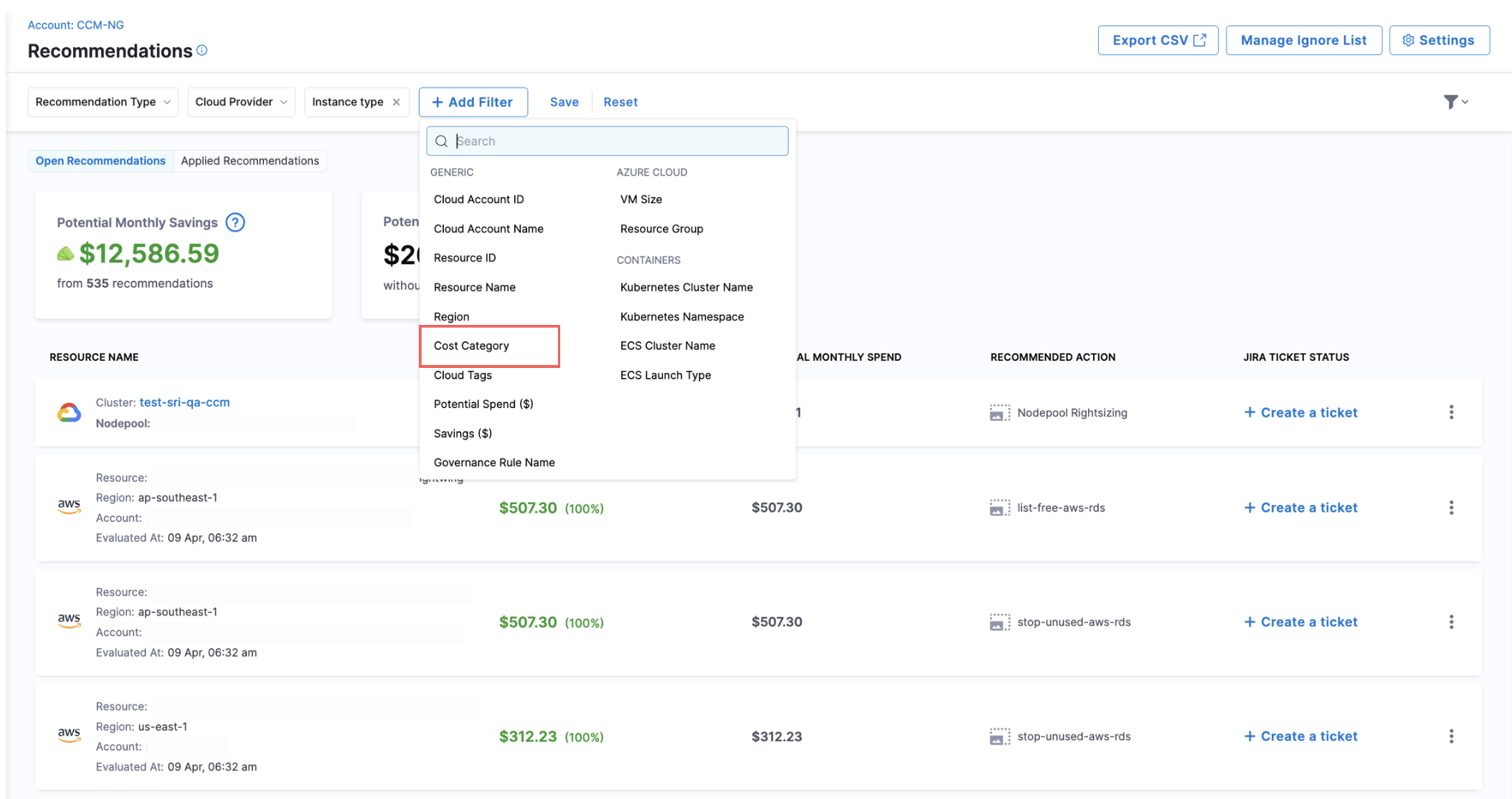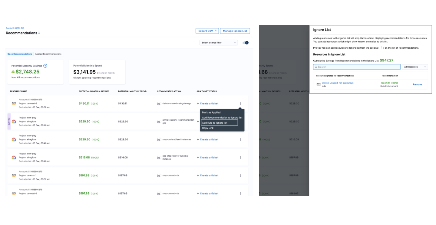 - Governance Recommendations: Resolved an issue where multiple "remove from ignore list" options were appearing for ignored Governance recommendations. The interface now correctly shows a single option to remove from the appropriate ignore level. [CCM-28071]