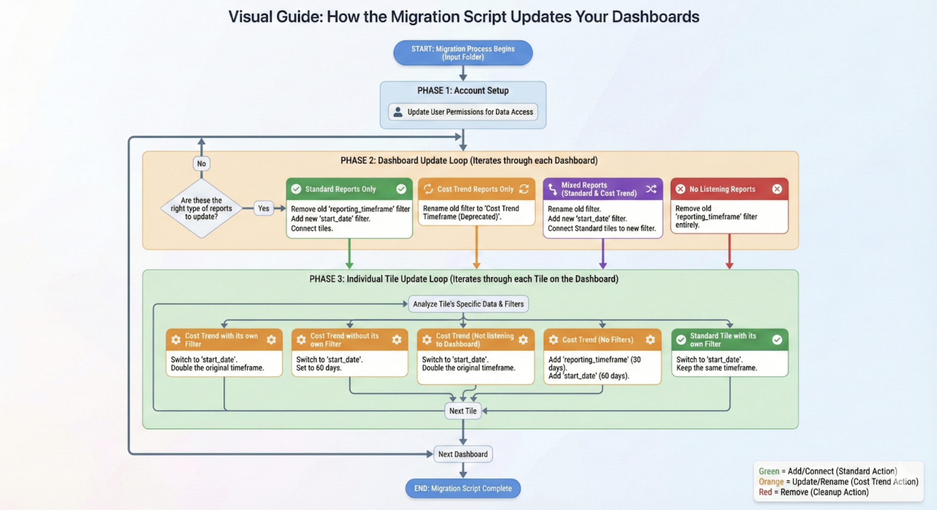 Element-Level Changes: For individual tiles and elements, the script will swap out the old reporting_timeframe filter for a standard start_date filter.